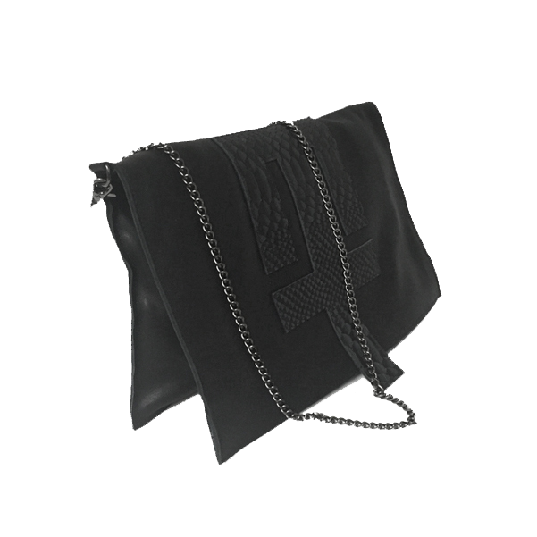 Original Signature Moodytwin Clutch bag with unfinished edges and gunmetal chain shoulder strap.