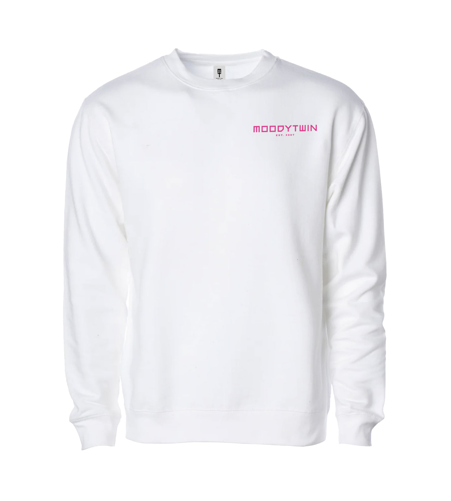 Premium Midweight Fleece Crewneck Sweatshirt with embroidered Moodytwin signature in Bright Pink. Timeless in design, constructed with quality.